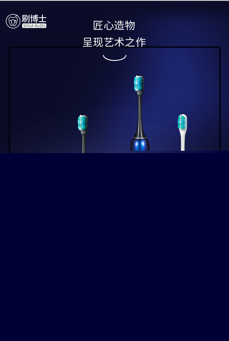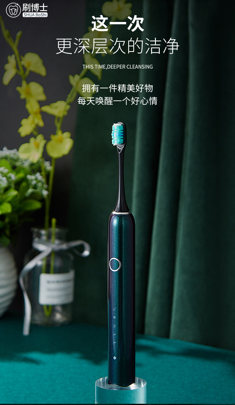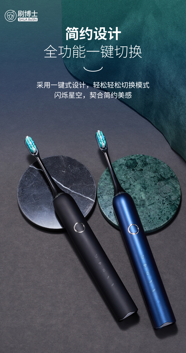 刷博士【S300智能聲波電動(dòng)牙刷】是一款集潔齒、護(hù)理及體驗(yàn)煥然一新于一身的多功能聲波電動(dòng)牙刷,采用一鍵式的簡約設(shè)計(jì),5檔清潔模式,隨心掌控;此外,植入了模式記憶功能,牢牢記住你的刷牙習(xí)慣,下次刷牙,無需費(fèi)時(shí)再次選擇;強(qiáng)勁的續(xù)航功能,一年僅充1次電;高顏值的顏色設(shè)計(jì),皓月白、睿智黑、深邃藍(lán)等多種顏色選擇,遇上不同風(fēng)格的你。